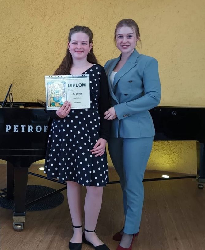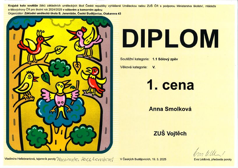 Blahopřejeme naší žákyni Anně Smolkové k získání 1. ceny v krajském kole soutěže základních uměleckých škol v kategorii sólový zpěv, která se uskutečnila ve dnech 19. a 20. března 2025 v ZUŠ B. Jeremiáše v Českých Budějovicích. Paní učitelce Sylvii Sedlecké děkujeme za vynikající přípravu!